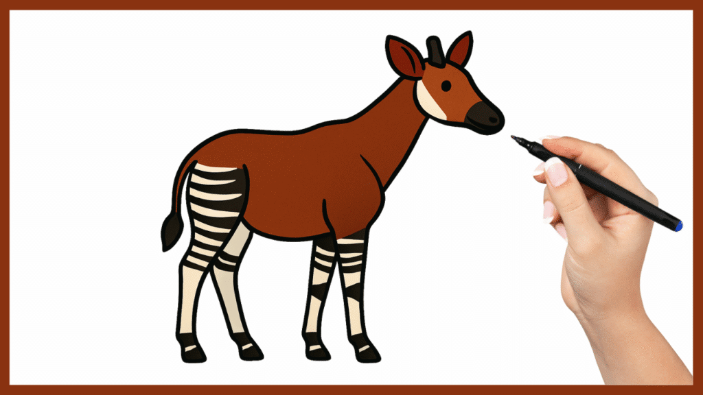 Commencez par dessiner les traits principaux de l’okapi : sa tête, son corps et ses pattes. Utilisez des repères simples comme des ovales pour la tête et le corps afin de poser la structure de base. Ensuite, les rayures noires et blanches sur les pattes ainsi que le dos brun foncé procurent à l’okapi son apparence caractéristique. Ces motifs zébrés sont une excellente occasion de pratiquer les détails et les contrastes dans votre dessin.