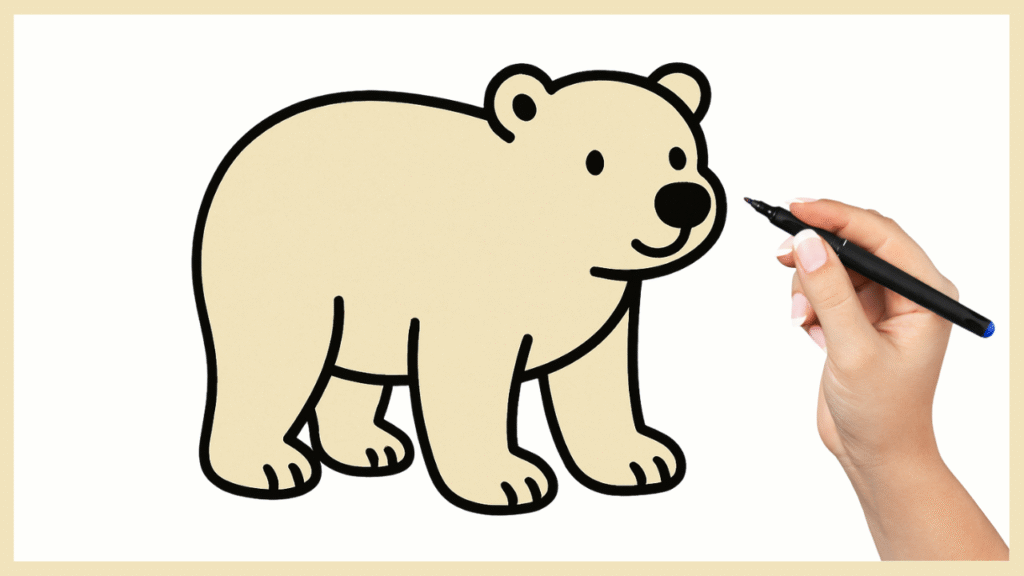 - Le corps : Il est généralement représenté par un grand ovale massif, positionné horizontalement. Ce volume suggère la puissance musculaire de l’ours et offre une structure sur laquelle les détails du pelage seront ajoutés.